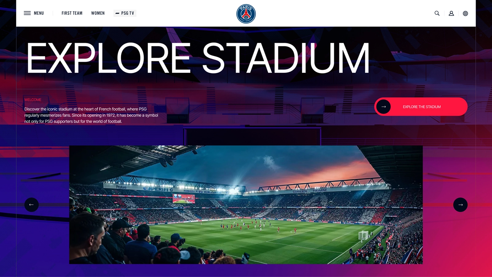 This concept presents a future-facing product website for Paris Saint-Germain, built around immersive 3D environments and interactive web storytelling. It shows how a modern football brand can translate the atmosphere of a stadium and the energy of the club into a dynamic web experience, combining real-time 3D, motion design, and interactive product presentation.